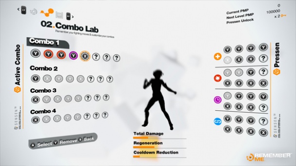 La gran novedad jugable que plantea Remember Me es el modo Remezclar, reescribir recuerdos. Entraremos en los recuerdos de ciertos personajes durante el juego en el que se nos permitirá jugar con sus recuerdos. La manera de hacerlo es rebobinar la escena en cuestión y encontrar fallos mnemotécnicos, como puede ser el de tener un jarrón en un sitio u otro de la habitación o el seguro de la pistola desactivado. Visualmente el modo es una maravilla, pues al igual que en la vida real nosotros no recordamos todos los detalles, como ciertas sección de la pared o la puerta, en este modo se cargarán todos los datos que recuerda el individuo, pero no veremos ciertas partes del suelo o la pared. A nivel visual es realmente una maravilla, al igual que a nivel narrativo, aunque quizás jugablemente tenga poco peso. Un gran añadido sería el de no tener solo una posibilidad, pues te hacen repetir la escena hasta que consigues que el sujeto tenga el recuerdo que te impone el juego. Poder terminar el juego con diferentes finales gracias a los recuerdos que has modificado sería a mi parecer el broche de oro a este modo de juego y que le daría un nivel rejugable muy alto al título. Por desgracia, durante el transcurso de las 10 horas jugables que dura más o menos este título, solo podremos disfrutar 4 veces de esta función, quizás algo corto para nuestro gusto, aunque dicen que lo bueno, si es breve, dos veces bueno.