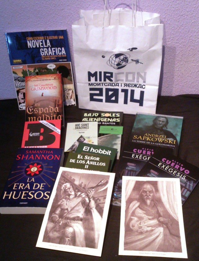 Tras una mañana cargada, tuvimos que dirigirnos al espacio Aqua, en el que se encontraban tantos los stands como el Teatro en el que se acogerían algunas charlas y presentaciones por la tarde. La comida fue también la oportunidad de comparar e intercambiar libros del pack de bienvenida de los inscritos, que conformaban los ejemplares cedidos por las editoriales que patrocinaban el evento. Un pack variado, que podía contener desde clásicos a novedades, incluyendo no ficción, láminas de Enrique Corominas (en nuestro caso, de personajes del Dorne) y códigos de descarga que prometen muchas horas de buena lectura.