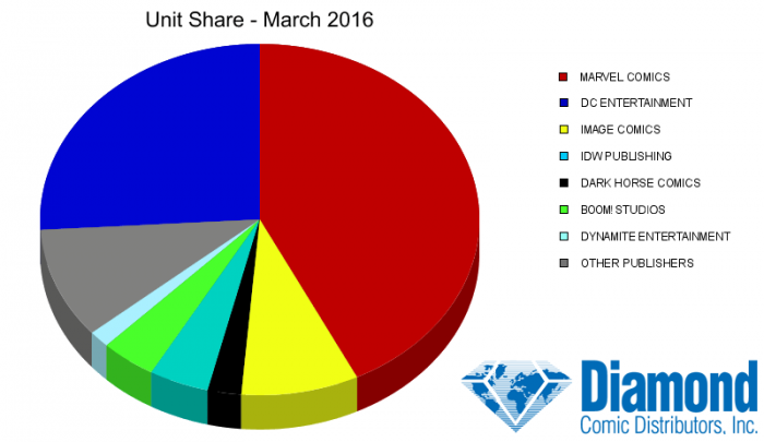 Como se puede ver en las tablas de arriba, Marvel Comics y DC Comics siguen siendo las editoriales americanas de cómics más importantes con bastante diferencia sobre las demás en lo referente a ventas, siendo además bastante evidente la superioridad de la primera sobre la segunda en cuando a unidades vendidas.