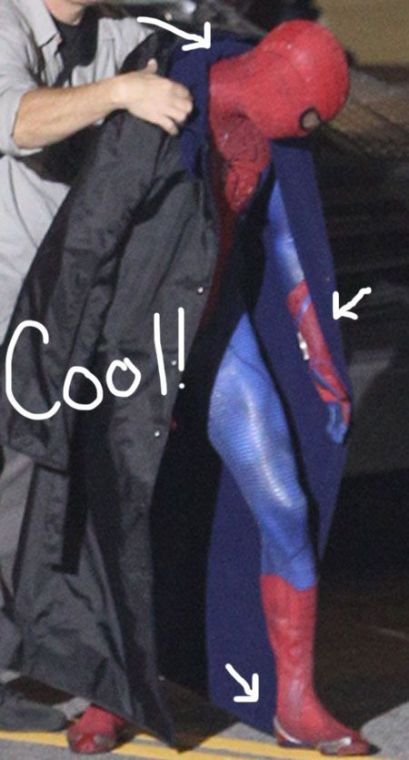 Aquí si queréis confirmamos que Spidey va a llevar lanza-redesen la peli. Pero a mi modo de ver son demasiado grandes ¿O eso es un reloj? En cuanto a los guantes, mi esperanza era que en la primera imagen que vio la luz, estos estuviesen rotos o algo, también se confirma que no, que son así.