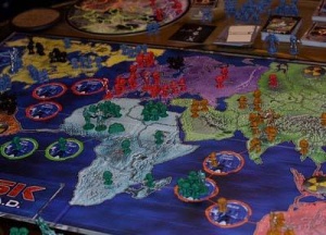 El Risk (Riesgo en inglés) es un EuroGame creado en 1951 por Albert Lamorisse y editado por Parker Brothers (Hasbro) a partir de 1957. En este juego de mesa, nuestro objetivo es conquistar el mundo. Existen un sin numero de versiones diferentes, cada una de ellas cambia o solo su estética o bien el modo de juego, haciéndolo mas complicado. Pero casi todas coinciden en lo mismo: Tenemos bajo nuestro control un nº de regiones/países y nuestro objetivo es ir conquistando las regiones adjuntas a estas, hasta hacernos con algún continente, conquistar X países/regiones o destruir a cierto jugador. Al comienzo de cada partida obtenemos una misión y según vamos avanzando, nos van dando mas tropas, normalmente adquirimos el nº de tropas que da el total de países que tenemos bajo nuestro control, dividido entre 3.