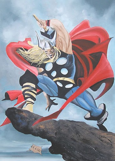 Una vez más, opino que la foto no hace auténtica justicia y debería admirarse en todo su esplendor, en vivo y en directo, pero no creo que mi casa tenga espacio suficiente para alojar a los miles de visitantes que tiene La Casa De El, así que opino que de momento os podrá valer esta imagen. Ese Mjolnir, esa capa, esa roca incluso con sedimentos de óxido de hierro e incluso esa “friki-firma” (idea mía) hacen que un cuadro normal y corriente se convierta en lo que podríamos llamar una obra maestra como la que estáis observando.