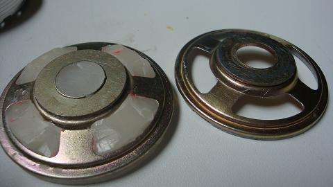 Una vez que tengamos en una sola pieza Motor/Cera/1 pieza de altavoz, cortamos un cacho de tela de rejilla negra y la pegamos sobre la parte central del altavoz, para pegar luego sobre ella la otra pieza restante de altavoz que nos quedaba: