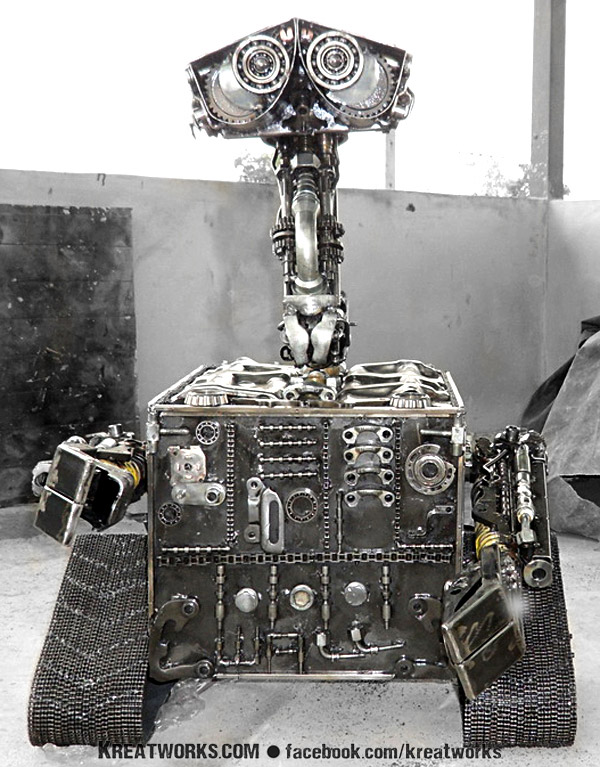 Lo que veis sobre y bajo estas líneas es una auténtica obra de arte que han realizado en Kreatworks. Se trata de un Wall-E hecho con piezas de coches y diversas máquinas viejas, con las cuales han conseguido materializar al famoso robot de la película de Pixar con unas medidas de 120 cms. de alto, por 60 cms de largo y 60 cms de ancho y un peso apróximado de 70 kgs. ¿Os gustaría tenerlo en vuestro poder? Pues podéis tenerlo desde aquí siempre y cuando paguéis los $2.800 que cuesta.