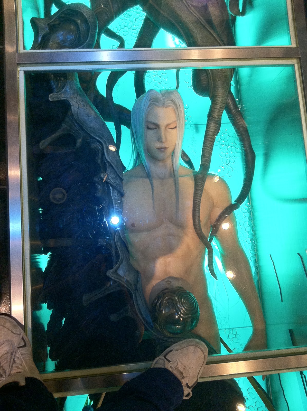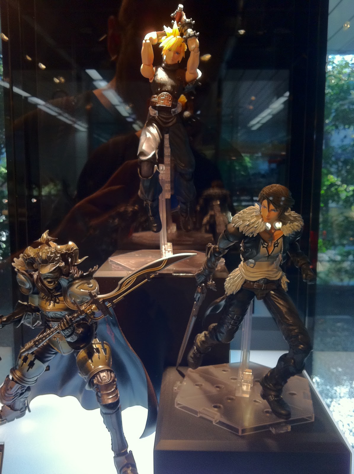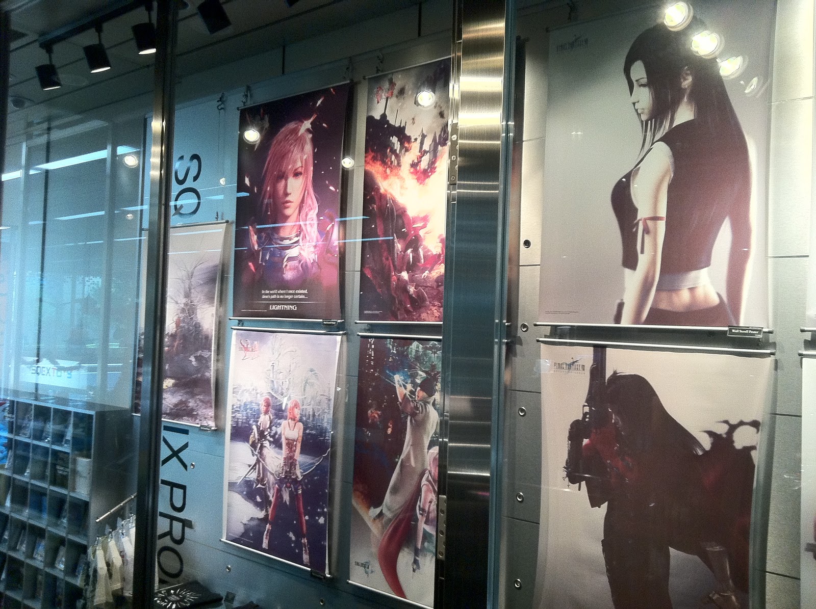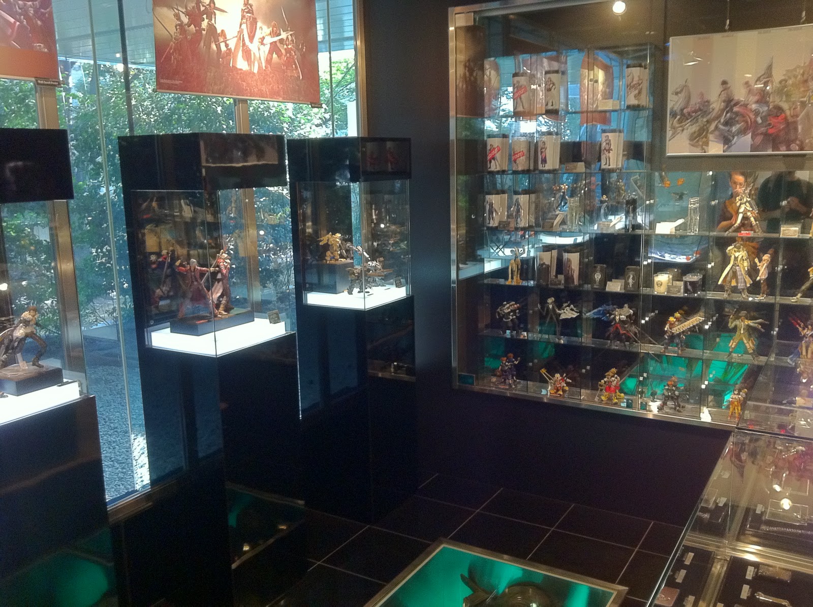 Entre otras cosas, podemos encontrar colgantes y joyería de nuestros juegos y personajes favoritos (desde el colgante de Squall de FF VIII hasta abrecartas en forma de espada) figuras de edición de coleccionista de diferentes personajes y algunas piezas que no están a la venta, pero que son dignas de admirar. Debido a que nosotros fuimos en plena campaña de promoción de Final Fantasy: Disidia 012, la tienda estaba abarrotada de posters y figuras de los protagonistas del juego, tanto fuera, como dentro de la tienda. Lo que más nos llamo la atención al subir los escalones a la segunda planta, fue, además de las ya mencionadas figuras, el Sephiroth (FF VII) a tamaño real que había bajo nuestros pies, como si estuviese en estado de hibernación, y que muy amablemente nos dejaron fotografiar (cosa que muy raramente pasa en las tiendas japonesas). Si os gusta todo lo relacionado con la compañía nipona, esta es una parada obligatoria en vuestro itinerario. Como ya os comenté antes, me la esperaba más grande, pero en cuanto a material y la relación calidad precio la verdad es que no nos podemos quejar.