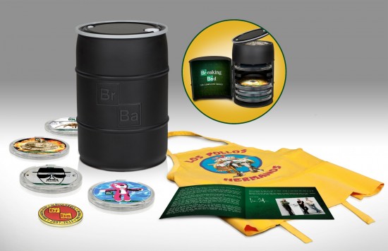 AMC ha anunciado el lanzamiento de Breaking Bad: The Complete Series en una edición súper especial –por ahora, solo disponible en el mercado USA. Será una réplica –edición coleccionista– del barril con dinero –conocido por todo seguidor de la serie-, y que contará en su interior más de 55 horas de características especiales de todas las temporadas de la serie, incluyendo un documental exclusivo de dos horas, un folleto de 16 páginas con letra de Vince Gilligan, una moneda conmemorativa –desafío– diseñado también por Vince Gilligan y un delantal de los Pollos Hermanos.