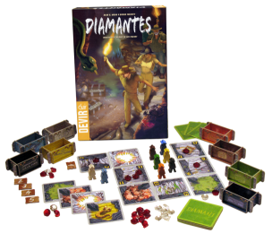 El Diamantes, todo un clásico de Alan R. Moon y Bruno Faidutti. Tengo que reconocer que, en total, quizás lo habré jugado un máximo de 20 veces. Y eso es bastante poco, teniendo en cuenta lo mucho que me gusta. Este juego se basa en el riesgo, un poco parecido a lo que vimos en los Dados Zombie, en el sentido de plantarse o seguir jugando a cambio de un mayor peligro. Yo tiendo a ser un jugador precavido (o cobarde, vamos), así que los juegos de riesgo no suelen ser lo mío, pero en este caso estoy encantado con el Diamantes, porque también premia, en cierto modo, que seas un cobarde. La premisa del juego es sencilla. Un grupo de exploradores entra en una cueva, en la que habrá piedras preciosas pero también trampas. Cada turno que pasa es más probable que suceda algo horrible, con lo que los exploradores, poco a poco, irán echándose atrás, llevándose con ellos las joyas que encuentren. Para los más valientes, habrá mayores recompensas (no hay que repartir tanto el botín) pero también habrá la posibilidad de que algo malo ocurra y se queden sin nada. Antes de seguir, veamos qué contiene la caja del juego.