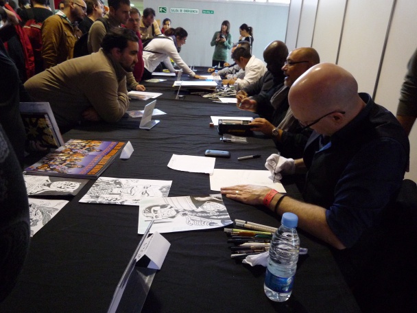 Para concluir, me gustaría señalar cuáles han sido mis impresiones sobre el Expocómic. Las instalaciones eran más que considerables y permitían un aforo muy amplio, pero durante los primeros días daba la sensación de que el espacio quedaba algo desaprovechado y que la ambientación de las instalaciones, salvo por algún troquelado de superhéroes y algún gran cartel publicitario, podría haber sido más generosa. Los problemas del frío se fueron solucionando con el transcurso de los días, pero, en mi caso, no me pude quitar la chaqueta hasta la tarde del sábado que el ambiente empezó a estar un poco más caldeado. Además, aunque en general las presentaciones y actividades han ido en hora, creo que sería de agradecer que cualquier modificación o cancelación que sufra el calendario, por pequeña que sea o por poca asistencia que esté teniendo, se comunicase o bien por megafonía o directamente a las personas que hayan asistido a verlo. Yo he disfrutado mucho con las presentaciones y con alguna que otra charla y me ha parecido una pena que la gente no haya aprovechado un momento cercano en el que poder charlar con los dibujantes y buscar una forma diferente de relacionarse con sus artistas que no sea pidiendo el dibujo de turno para poner en la estantería. Por último, creo que no se ha hecho publicidad suficiente de el Salón y que deberían invertir más dinero en ese ámbito para aumentar de forma considerable el número de asistentes. Estoy seguro de que si se pulen esas pocas aristas, se obtendrá un festival inolvidable el próximo año. Habrá que esperar al Expomanga 2014 o al Expocómic del año que viene para comprobar si estos pequeños detalles mejoran. ¡Seguro que sí!