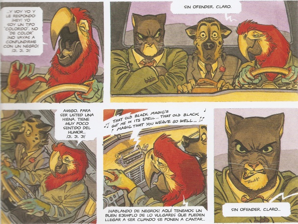 A lo largo del tiempo, desde que se publicó el primer volumen, siempre se ha dicho que los guiones de Juan Díaz Canales se limitaban a seguir punto por punto los esquemas del género, cosa que es, o más bien era, cierta y por lo que, en algunos casos, no se le ha brindado el mismo reconocimiento que a su compañero. Y es que es cierto que a simple vista puede parecer que el talento del guionista queda eclipsado por el soberbio dibujo de Guarnido, sobre todo en el primer volumen, Un lugar entre las sombras. Personalmente, creo poder defender que desde aquel primer libro ha llovido mucho para Díaz Canales dentro de la obra de Blacksad y, si en aquella primera incursión del detective su talento se vio sujeto únicamente a soportar los pilares del género negro, a día de hoy, su narrativa se ha ido puliendo libro a libro hasta llegar a un punto de inflexión en Alma roja. A lo largo de tres volúmenes demostró haber cogido al detective de la mano y aferrarse a su original idea mezclar género y fábula hasta crear lo que es a día de hoy, una de las obras más reflexivas y concienzudas del género en formato de viñeta. El infierno, el silencio fue un inpás, una historia en cierta manera más distendida o, mejor dicho, un cambio de aires. Podríamos decir que abría otro nuevo mega volumen en la historia de Blacksad del que Amarillo forma parte y es continuación directa. Al guionista, al igual que al personaje, lo vemos relajado, creando una historia que crece de manera exponencial, con soltura y ritmo, sin llegar, no obstante, a la genialidad con la que supo vestir alguno de los capítulos pasados de los que hemos citado.