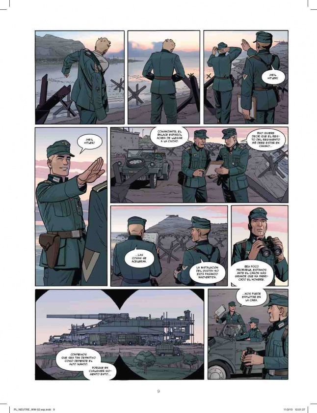 Por otro lado, en este tomo, a diferencia del primero, podemos apreciar un tono mucho más enfocado a la acción y al terreno bélico. Esto es, mientras que en el anterior apenas veíamos nada de la Batalla de París, en el presente volumen somos testigos de la crudeza de la guerra y las distintas operaciones que se llevan a cabo para invadir la zona. Por tanto, al poseer más acción, su lectura es más dinámica y permite aprender algo de estrategia militar. En consecuencia, el guionista, José Manuel Robledo, ha estado muy acertado tanto en plasmar la hipotética situación histórico como en reflejar las maniobras de los distintos bandos. Quizá el único fallo de la trama radique en su parte final algo confusa, pues, como veremos, los giros argumentales se van sucediendo, lo que, unido al desorden de la guerra, provoca que todo resulte bastante caótico.