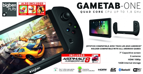 [quote] Además de incorporar un hardware ideal para videojuegos, GAMETAB-ONE esconde en su interior unas características descomunales. Su procesador Quad Core de más de 1.8Gh, una memoria RAM de 2Gb DDR3 Dual Channel y una pantalla de 7” a 1024 x 600p hacen de GAMETAB-ONE una bestia para reproducir cualquier juego Android sin ningún tipo de limitaciones. Además, incluye una salida HDMI 1080p gracias a la cual podrás conectar tu GAMETAB-ONE a la televisión para disfrutar a lo grande de juegos, películas, fotografías… Otras características a destacar son: acelerómetro de 3 ejes, Android 4.2.2, dos cámaras, micrófono y altavoz, batería de 4000 mAh…[/quote]