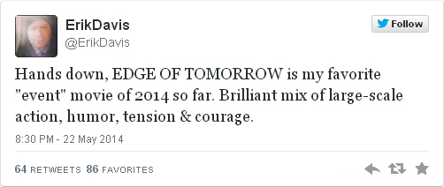 “Sin duda, AL FILO DEL MAÑANA es mi película “evento” favorita de 2014 con diferencia. Brillante mezcla de acción a gran escala, humor, tensión y valor.”