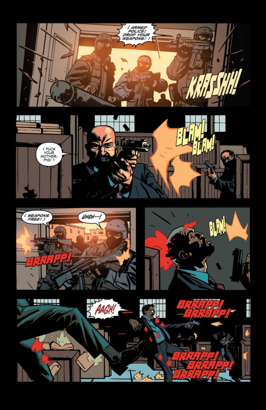 Para esta ocasión, el creador de ‘Los muertos Vivientes’ decide utilizar un tercer grupo de personajes que aún no habían aparecido firmemente en la historia: la mafia italiana. Con el objetivo de salvar a su hijo de las manos de ‘Lola’, Conrad Paulson decidirá reunir a su antiguo equipo y lograr dar un golpe con el que obtendrá 10 millones de dólares. Ese golpe, como os podéis imaginar, es el gran robo que hasta ahora el protagonista había venido rehusando dar. Con tres situaciones simultáneas, como son el desarrollo del golpe en Venecia, el traslado de Augustus en camión o la persecución por parte de la agente Liz, estamos ante un buen volumen que pone broche final a varios interrogantes, aunque dará pie a nuevos.