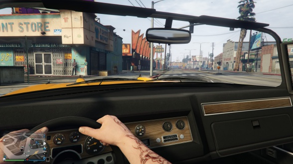 Pero no todo es disparar en GTA, también es conducir, para lo que Rockstar ha desarrollado unos interiores de los vehículos y unas animaciones increíbles. Cada uno cuenta con un interior diferente, pudiendo ver perfectamente el salpicadero y las agujas de este moverse a tiempo real, mientras que si giramos la vista hacia la radio, dependiendo del modelo de esta, podemos ver escrito en su panel el nombre de la emisora o la canción que está sonando. También han cambiado el sistema de apuntado desde los coches, permitiéndonos ahora disparar perfectamente desde su interior.