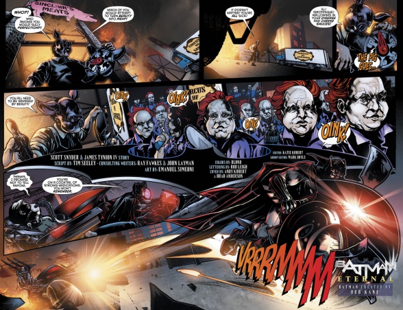 Desgraciadamente, en este segundo recopilatorio, más que centrarse en desarrollar más la trama principal, a mi juicio la historia más interesante de todas las planteadas con bastante diferencia, se nos introducen nuevas incógnitas y la historia se centra en diferentes personajes más allá del Cruzado de la Capa. Así, sin desvelar mucho, el primer episodio de la entrega, cuyo guión corre a cargo de James Tynion IV, se dedica a profundizar en un aliado de Batman: Red Robin, de los Jóvenes Titanes, quien investiga las maldades del profesor Pyg, cuyo ataque propició el incidente de Gordon ya contado. A lo largo de sus pesquisas, se topa con una tecnología muy avanzada y extraña y con una reciente aliada del Mejor Detective del Mundo: Harper Row.