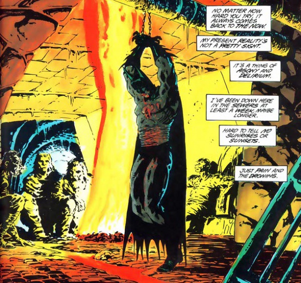 Al lado de Starlin, un clásico entre los clásicos, el señor Bernie Wrightson. El legendario creador de Swamp Thing despliega toda su artillería visual gracias al contexto de pesadilla que Starlin proporciona. Las terroríficas visiones y delirios que pueblan la atribulada mente de Batman sirven como excusa para la recreación de un sórdido gótico urbano que acrecienta la sensación de agobio y claustrofobia. El reino subterráneo de Blackfire parece extirpado de una pesadilla, gracias a los aires de horror clásico que Wrightson imprime en su recreación gráfica de esta caída al Inframundo. Un trabajo que sigue impactando, gracias a la labor de un tipo con oficio y experiencia, dueño de un estilo propio y armado con la cantidad de recursos necesarios para sorprendernos en más de una ocasión.