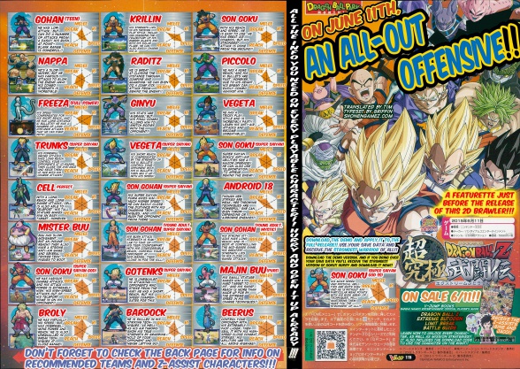Los de ShonenGamez han tenido la bondad de traducir el scan al inglés con algunos datos de los personajes y por ello les damos las gracias. Se echan en falta luchadores como los compañeros de Goku, Goku en tercera u otros enemigos de peso, aunque muchos personajes pasarán a ser compañeros en la lucha, asistentes con ataques especiales. Justamente se han anunciado también dos asistentes para el juego que sólo podremos desbloquear si compramos la guía del juego ‘Dragon Ball Z Extreme Butoden Limit Break Battle Guide’, Jaco y Gine, la madre de Goku.
