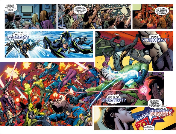 Es decir, por un lado los mantiene a todos (o casi todos) en varios recintos controlados y, con el fin de investigar acerca de ellos y de permitirles utilizar su poder, ha organizado un concurso televisivo, llamado ‘America’s Got Powers’ (de ahí toma el título esta miniserie). En este programa de lucha varios muchachos seleccionados tras pasar un arduo entrenamiento se enfrentan entre sí en diversas pruebas con la finalidad de formar parte del único grupo de superhéroes autorizado por el Estado. A causa de su particularidad, esto es, ser el único concurso en el que pueden tomar parte superhéroes es extremadamente popular en todo el mundo.