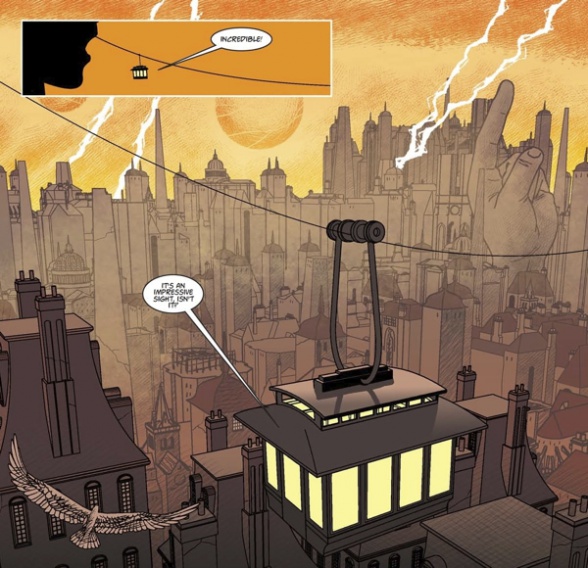 Para eso tenemos un aspecto gráfico que es fabuloso. Pasa lo mismo que con el lado literario, que parece sencillo en extremo, pero esconde un trabajo fastuoso que da una identidad bestial al mundo que representa en papel. Cada planeta que visita en su periplo Wren es tan extraño como fascinante, y el maravilloso arcaísmo de la tecnología de la Rueda de los Mundos dejará satisfecho al más exigente fan de la ficción steampunk, de la que bebe en todo momento. Aunque, para ser honesto, da un paso más en esta clase de ciencia ficción, y la verdad detrás del extravagante mecanismo de este ingenio espacial nos dejará con ganas de saber más. El uso del color es otro acierto fundamental, que hace que algunas de las viñetas de este cómic sean de las más bonitas que he visto en años.