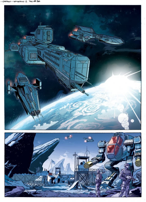 Con respecto al dibujo, la calidad es muy buena. Hay que recordar que estamos ante una serie que se publicó con periodicidad mensual: 100 páginas al mes durante un año. Era imposible que un solo dibujante se encargase de ella, así que decidieron crear un estilo conjunto. Emiliano Mammucari, que dibuja el primer número al completo, se ocupó de todo el diseño gráfico de la serie. Para ello escogió un aspecto visual sintético, minimalista, al que pudieran adaptarse varias personas sin que la obra perdiera cohesión. Mammucari además realizó un estudio exhaustivo de la mayor parte de aspectos visuales de ‘Huérfanos’, siempre en colaboración con el guionista: personajes, armas, naves, escenarios… todo quedó definido en una especie de manual en el que los demás dibujantes podían basarse.