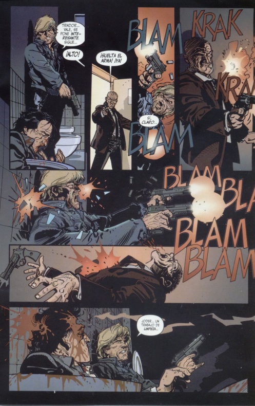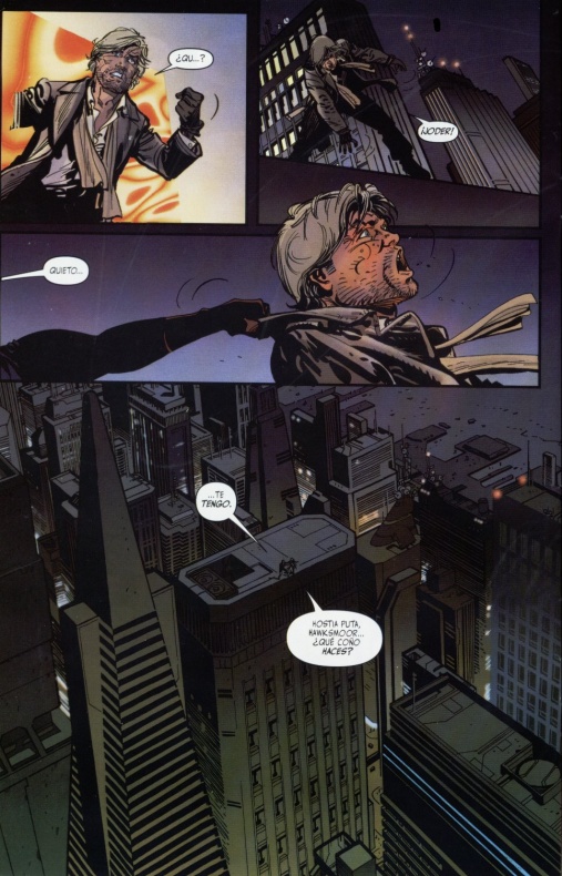 Esto parece la típica trama de una película de Humphrey Bogart, ¿verdad? Pues sí, pero lo que hace aquí Brubaker es meter en el papel del protagonista a Cole Cash, más conocido como Grifter, antiguo miembro de Wildcats, poner a John Lynch, el Nick Fury de este mundo y miembro de Team 7 y Gen 13, en el papel de víctima, transformar los bares de mala muerte en locales como Domino’s, un centro de reunión de tipos con superpoderes y mejoras cibernéticas, usar como Macguffin de la trama a Holden Carver, el personaje central de ‘Sleeper’, y ubicarlo todo dentro del universo Wildstorm.