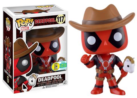 En primer lugar tenemos un nuevo Funko POP! de Deadpool, aunque en esta ocasión no solo encontraremos al mercenario bocazas vestido con su traje rojo y negro habitual, sino que también cuenta con un sombrero de cowboy sobre su cabeza y un palo con cabeza de caballo en su mano izquierda.