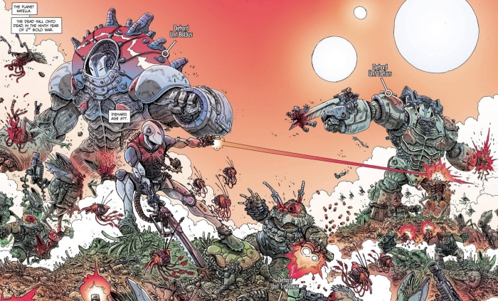 Aunque en algunas páginas el dibujo puede flojear, en general estamos ante una fiesta para los ojos. Visualmente hablando en este cómic se utilizan recursos narrativos de lo más original que hacen que la buena labor en el dibujo, apoyada por un color excelente, luzca aún mejor. Quizás lo más especial que tiene esta obra es el tiempo que puedes gastar como lector sumergiéndote en cada página, ya no solo para ser capaz de comprender correctamente lo que el autor está contando, sino para admirar todos los detalles de cada viñeta, en algunos casos recargadas hasta el límite justo para no causar rechazo. Y es que, como comentaba antes, los conceptos y las ideas que el guion nos deja caer están a la vanguardia de la ciencia ficción, incluso cuando comparamos este cómic con la obra de algunos de los más reconocidos autores de este género, pero no serían nada sin la vida que cobran gracias a su maravilloso dibujo, liderado por los artistas Simon Roy, Giannis Milonogiannis y Dave Taylor.