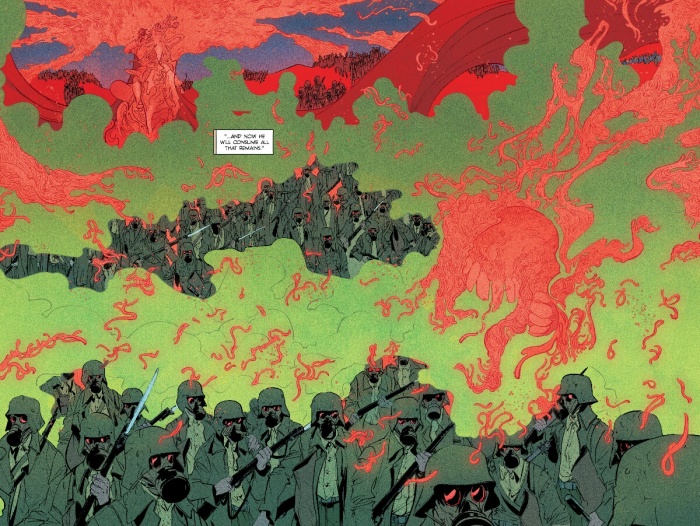 Nada más abrir el tomo estupendamente editado por Astiberri Ediciones nos encontramos con la agradable sorpresa de ver de nuevo a Mariposa y Conejito, los dos narradores que ya nos acompañaron al comienzo de cada capítulo del primer arco argumental. En esta ocasión son ellos los que nos hacen saber que un personaje ya conocido, el de Sarah, está a punto de morir. Su muerte se producirá de forma natural, en la cama y rodeada de su familia… aunque no de toda su familia. Su hijo Cyrus se encuentra a miles de kilómetros de allí, combatiendo en Francia en la Primera Guerra Mundial (llamada entonces “La Gran Guerra”) en un entorno recreado aquí con gran acierto en el que más de nueve millones de combatientes perdieron la vida, un número no demasiado elevado si tenemos en cuenta que se trató de una guerra en la que más de setenta millones de militares tomaron parte. Este evento tuvo lugar entre los años 1914 y 1918, periodo durante el cual los Estados Unidos aún conservaba en ciertas zonas ese ambiente de western tan característico de la primera parte. Esta nación aportó fuerzas a los ejércitos del bloque formado por Reino Unido, Francia y el Imperio Ruso, y de ahí la implicación de Cyrus en la batalla.
