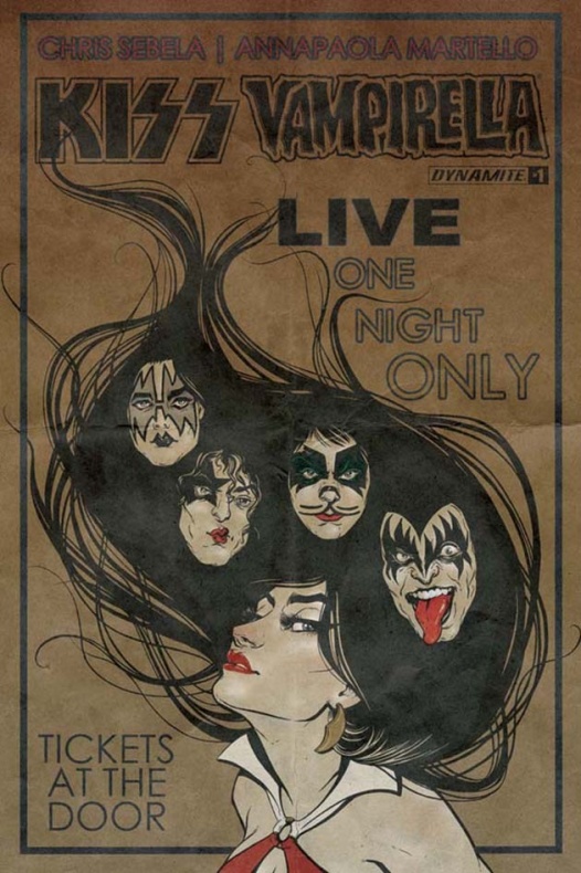 Los crossover entre franquicias que sean raros, curiosos pero a la vez sorprendentes están causando furor en el mundo del cómic hoy en día, y la editorial Dynamite Entertainment consciente de ello, acaba de subir el listón creativo con su nueva apuesta. KISS, la legendaria banda de rock, hará equipo con Vampirella en una misión para salvar el rock and roll en plena década de los 70, en una miniserie que está escrita por Chris Šebela e ilustrada por Annapaola Martello, y que saldrá a la venta en junio de 2017.
