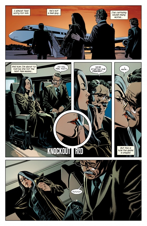 De esta forma, en este tercer tomo nuestra protagonista tendrá que ir nada más y nada menos que hasta Washington, D.C. para descubrir quién es el gran villano detrás de todo. Sus pesquisas la han llevado a relacionar la muerte del agente Keller con la administración del presidente Richard Milhous Nixon y con el famoso incidente del hotel Watergate, un toque de genialidad del guionista que ayuda al lector a no perderse en una trama que a veces puede parecer un poco compleja, poniendo un pilar de historia real conocida sobre el que poder asentar el resto de información y a la vez introduciendo una vertiente política en la historia. Pero además de intriga, en este tercer arco los autores nos presentan también, al igual que en los anteriores, persecuciones en coche, seducciones, peleas a puño cerrado y tiroteos. El hecho de que la acción transcurra hace más de cuatro décadas obliga al guionista a recurrir a escenas de acción más físicas y con un nivel de tecnología muy elemental, sin utilizar recursos del género de espías más vanguardista, algo que no casaría con el tono que se le ha querido dar a la obra.