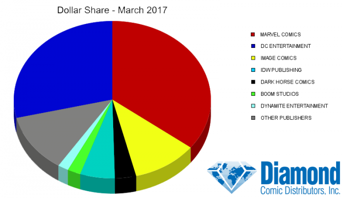 Os traemos información relativa a las editoriales y a cómo las ventas de sus cómics en el pasado mes de marzo han afectado a su posición dentro del mercado americano. En esta ocasión la cosa se ha puesto muy reñida, ya que aunque Marvel Comics es la editorial con una mayor cuota de ganancias, DC Comics se sitúa como la editorial que más unidades ha vendido. La tercera en discordia, Image Comics, se sigue manteniendo en un lugar a bastante distancia de las dos grandes por arriba y también del resto de editoriales por debajo.