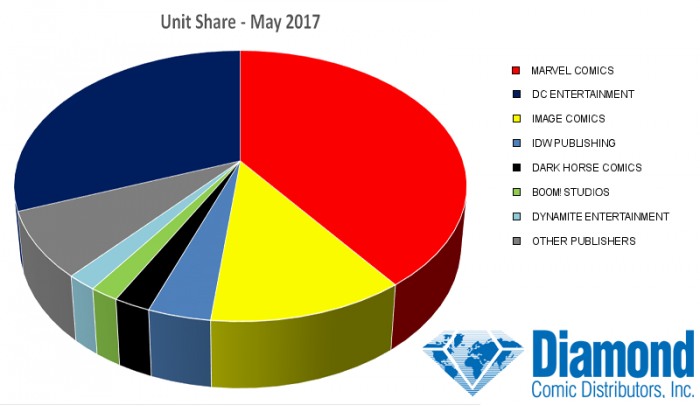 Os traemos información relativa a las editoriales y a cómo las ventas de sus cómics en el pasado mes de mayo han afectado a su posición dentro del mercado americano. En esta ocasión Marvel Comics ha aumentado su ventaja otra vez más con respecto a su perseguidor, DC Comics, con lo que la Casa de las Ideas se afianza de nuevo como la editorial de cómics más importante de Estados Unidos. La tercera en discordia, Image Comics, se sigue manteniendo en un lugar a bastante distancia de las dos grandes por arriba y también del resto de editoriales por debajo.