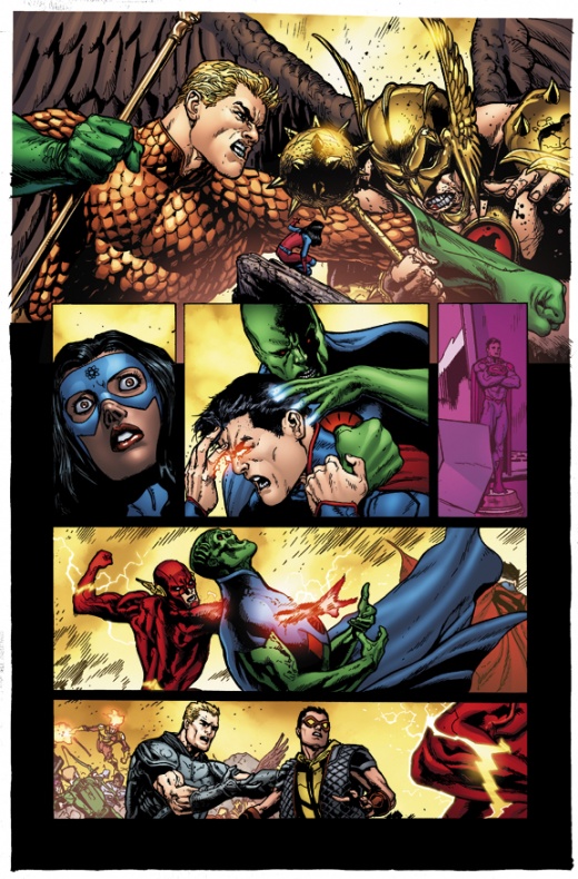 En resumen, estamos ante una trama muy coral en la que todos los personajes protagonistas tienen su momento, con algunos giros inesperados que pueden hacer que a más de uno se le salte el monóculo. En la parte negativa, hay que decir que aunque la parte troncal, la correspondiente a los guiones de Geoff Johns, está a un nivel bastante alto (a pesar de que alcanza realmente la cúspide ya casi en el último tercio del tomo), en el resto de historias el nivel es un poco más irregular. Y no nos olvidemos de algunos recursos levemente tramposos que se usan en alguna que otra ocasión, que podrían enfadar a algún lector demasiado exigente.