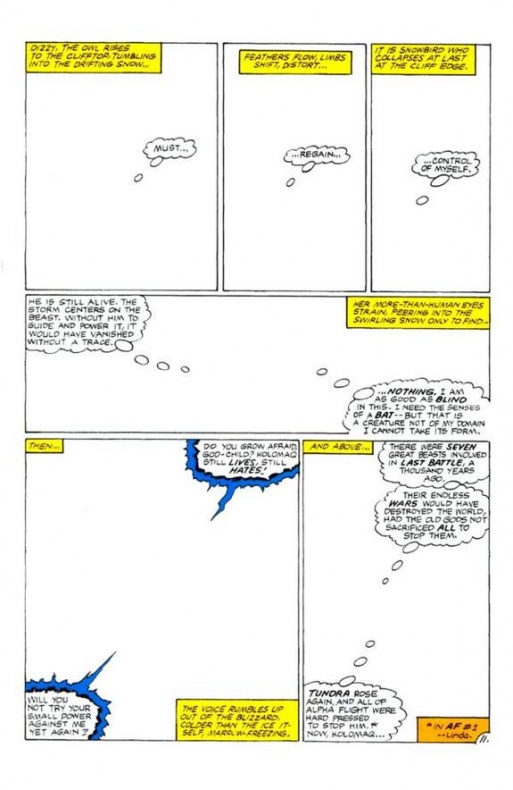 Hace unos años, John Byrne nos mostró una situación totalmente diferente de lo visto hasta el momento en los cómics en ‘Alpha Flight’ #6, donde vimos a Snowbird luchar contra una entidad de nieve nativo americana en medio de una ventisca de nieve. Lo que hizo fue dejar las viñetas en blanco y lo único que podía ver el lector eran los golpes y pensamientos de los personajes. Os dejamos cómo lo hizo a continuación:
