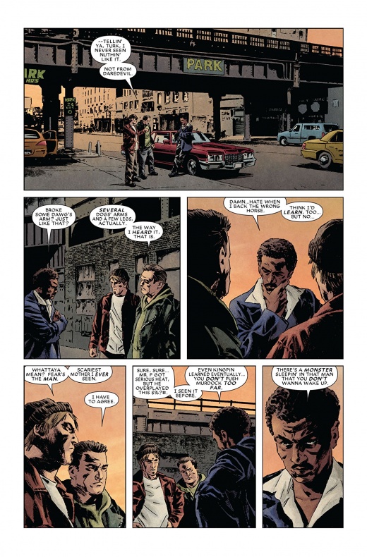 Gracias a las alucinaciones que Mr. Miedo provoca en Daredevil tenemos la excusa perfecta para dejar al extraordinario Michael Lark descansar y utilizar a grandes artistas de la historia del personaje para que aporten su granito de arena al centenario del segundo volumen de la serie. Alex Maleev, Bill Sienkiewicz, Gene Colan, John Romita Sr. y Al Milgrom entre otros son los invitados especiales en este tomo, algo que lo convierte en un volumen muy especial.
