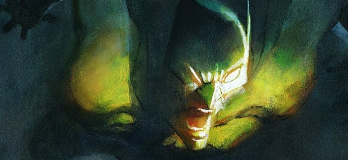 La portada publicada en Twitter por Sienkiewicz muestra una versión estilizada del mejor detective del mundo saltando. Para aumentar la atmósfera de terror podemos ver la figura de Batman iluminada por una fuente de luz verde amarillenta.