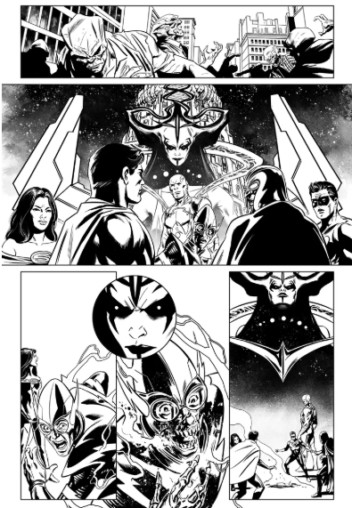 Las siguientes páginas sin maquetar y sin color muestran cómo se ha producido este fatal desenlace donde se ve que Johnny Quick se convierte en cenizas al pie del trono de Perpetua con otros villanos mirando.