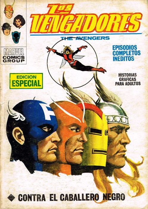 Aunque las portadas de Enric Torres-Prat para la colección de Los Vengadores, en Vértice, no se cuentan entres sus obras más logradas, sus último trabajos en dicha cabecera mostraron una considerable mejoría. El perfil de todos los integrantes varones del grupo, en toda su gloria, bajo la representación de una Avispa que luce un tamaño bastante similar al natural, es una obra original del dibujante que funciona bastante bien sobre ese fondo blanco. No obstante, como apunte personal, me gustaría añadir que resulta curioso que, dado el título del volumen, el Caballero Negro no aparezca retratado por ninguna parte.