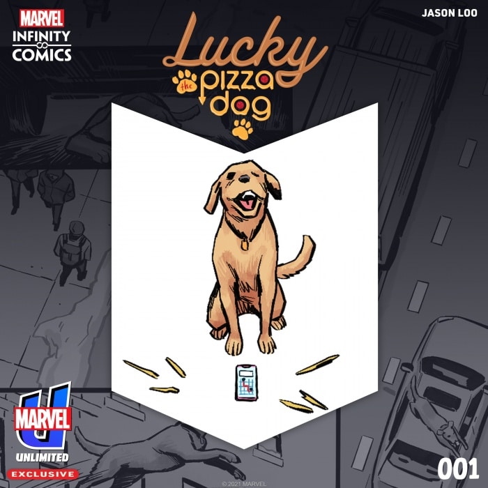 Aprovechando la salida de la serie de Ojo de Halcón, desde la plataforma de Marvel Unlimited han querido proporcionar un número único centrado en el personaje. Titulado como Lucky the pizza dog, nuestro protagonista canino investigará el misterio de una pizza que nunca llegó a su destino.