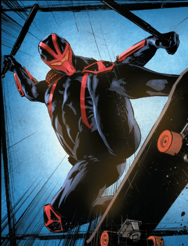 Como armas tiene unos bastones, al igual que Daredevil, que porta en la armadura. En su antebrazo derecho tiene una hoja de titanio retráctil y en el izquierdo puede llevar su monopatín (skate) reforzado en adamantium, que le servía de escudo, pero también como arma ofensiva porque de este podía salir una cuchilla, que sintió El Castigador en el enfrentamiento que tuvieron, dibujado por Bagley-. Además, porta micro misiles y un mini subfusil Uzi.