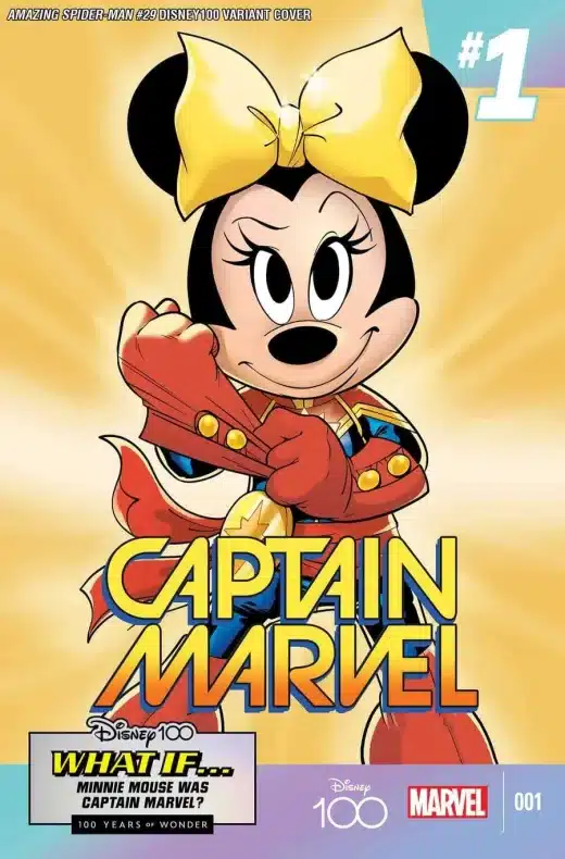 Minnie como Capitana Marvel: Sí, has leído bien. Minnie Mouse se viste de heroína cósmica y es que no hay mejor forma de cerrar este ranking que con un personaje tan querido como ella. Imagina esa combinación de fuerza y dulzura en una sola portada, un cruce entre el empoderamiento de Capitana Marvel y el encanto eterno de Minnie.