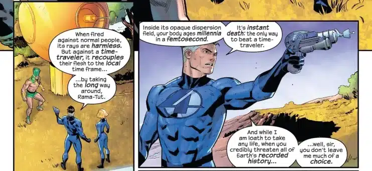 En Fantastic Four #17, la confrontación entre Reed y una variante de Kang, Rama Tut, sirve de escenario para la revelación de esta invención. Mientras Tut intenta alterar el curso de la historia humana primitiva, Richards y Sue Storm idean un plan que gira en torno al “recoplador temporal”, prometiendo una “muerte instantánea” para el invasor temporal. Este enfoque brutal subraya lo que Richards podría ser capaz de hacer si no se adhiriera a su código heroico.