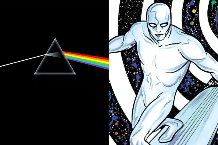 El grupo musical Pink Floyd (que estuvo en activo desde 1965 hasta 1995), que ya había mostrado al Doctor Extraño en la carátula de su disco A Saucerful of Secrets (1968), tampoco se quiso privar de la oportunidad de lucir a Estela Plateada en un trabajo posterior, llamado The Dark Side of the Moon (1973), aunque, finalmente, el cantante y compositor David Gilmour lo acabó descartando, en favor de otro diseño creado por tres trabajadores de la empresa Hipgnosis, cuyos nombres eran George Hardie, Storm Thogerson y Aubrey Powell.