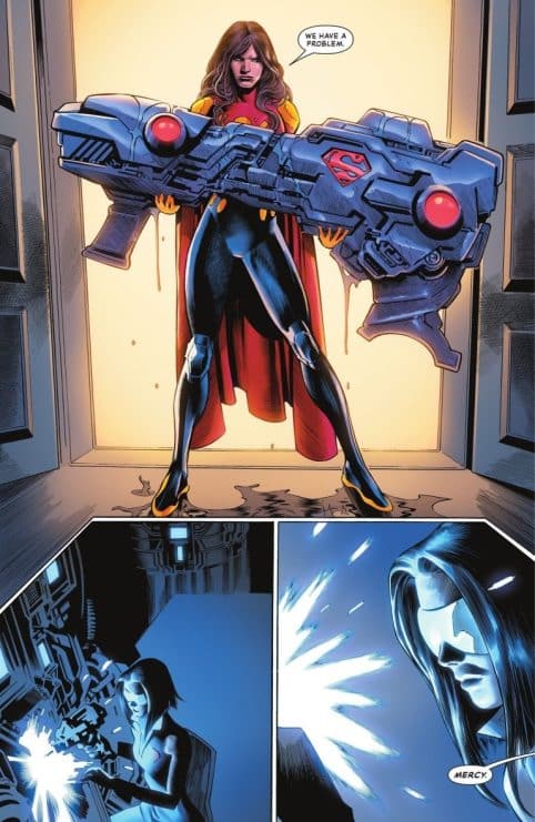Mientras Superman todavía está valorando si todo ese poder tecnológico debería salir al mercado, Superwoman (Lois Lane) acude a una misión con la Liga de la Justicia. Y ahí salta la alarma: uno de los enemigos usa un arma con el logo de SuperCorp. ¿Cómo ha llegado eso a sus manos? Al regresar, confrontan a Mercy, que admite que ese arma, llamada Super-Gun, aún no debía estar en circulación, pero sí pensaba venderla pronto. Superman no se lo piensa y la despide al momento.