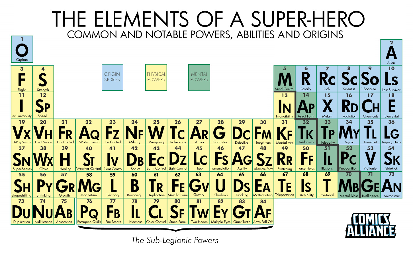 Ayer un amigo (Mr. M) me envió por correo una curiosa tabla periódica que seguramente hará las delicias de todos los aficionados a la química a los que les gusten los superhéroes. En dicha tabla que han creado los chicos de ComicsAlliance nos encontramos la mayoría de superpoderes, llegando incluso a darse el caso de poderes extraños como es el elemento AF, el cual hace referencia a “Arms Fall Of” un superhéroe de DC al que le pasaba eso mismo, que se le caían los brazos.
